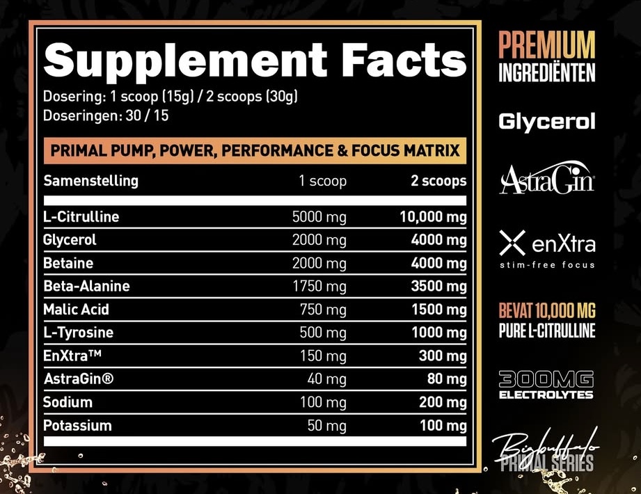 🔥 8000 mg citrulline – Spot-on! Veel pre-workouts bezuinigen hierop omdat het een duur ingrediënt is, maar Big Buffalo doet dat niet. Dit betekent een extreme pomp en betere doorbloeding.
