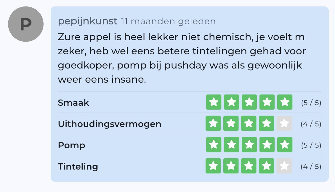 Binnen de Sportpoeder community scoort de Origin Pre-Workout van Myprotein erg goed. Vooral de goede pomp en scherpe prijs maken deze pre-workout een favoriet onder sporters. Veel gebruikers prijzen de goede doseringen van L-citrulline en L-arginine, waardoor de doorbloeding en spierpomp optimaal zijn.